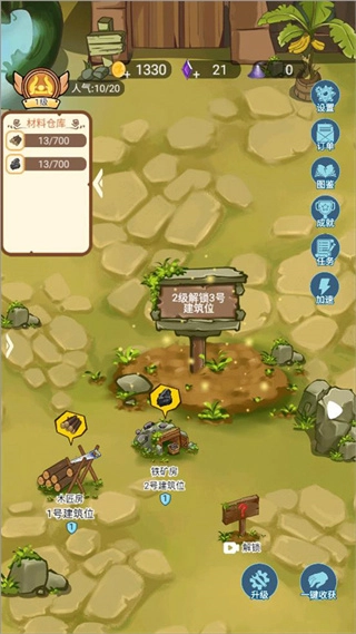 1、经营专属装备铺子,生产并出售武器来获取资源,逐步扩建部落设施。