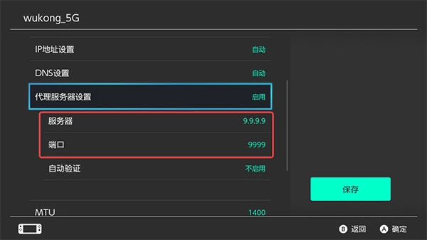 3、将“代理服务器设置”切换为“启用”状态,并依照加速器中的网络设置页面的提示信息,将“服务器”、“端口”信息进行设置。