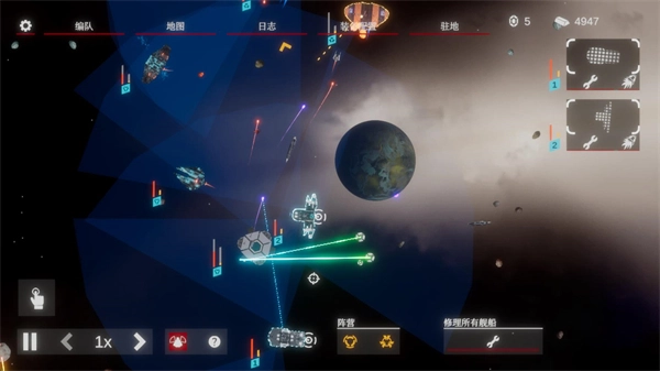 当舰船进入新区域并遭遇敌人时,会自动发起攻击;击败敌人后,点击扳手按钮即可对舰船进行维修。