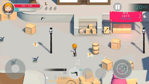 游戏正式开始后,角色会出现在街道上,周围会不断有鸽子围拢过来发起攻击,你需要用手中的武器进行反击,消灭这些鸽子后它们会掉落一些物品。