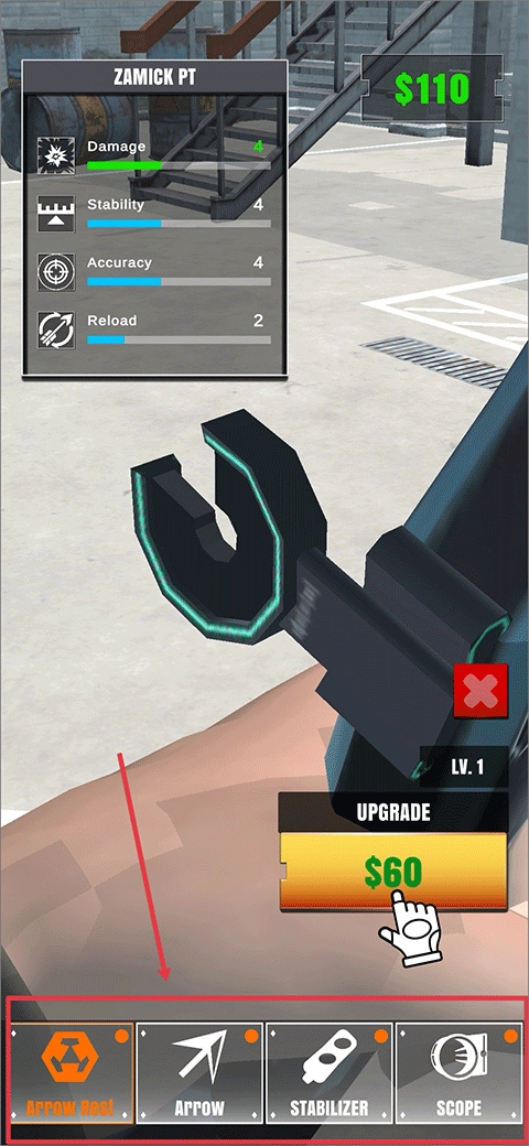 在游戏初始界面的UPGRADE选项里,你能够对弓箭的各类配件进行升级。