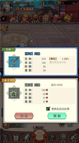 如果当前获得的装备属性比已有的低,就把它卖掉;要是属性更高,直接装备上就行。