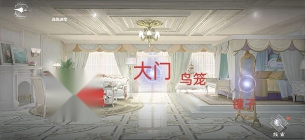 第一个房间里,先在棋盘处观察并摆放棋子,接着触摸棋盘,然后去鸟笼处观察、摸索,之后回到棋盘处放置棋子,再到大门处使用钥匙,最后离开房间。