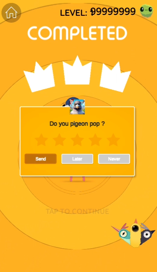 3、完成LEVEL1,看【COMPLETED】界面,点击继续,争取收集更多道具获皇冠,提升关卡评价,解锁新挑战。