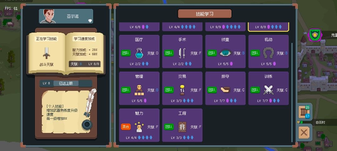 技能的优先级很关键,前期要优先提升交易技能,不管是主角还是青梅,都得先把交易点到10级满级。之后就可以分开升级其他技能了,优先考虑训练、掠夺、手术、管理、机动、侦察这些(主角和青梅可以各选不同的技能点,不用保持一致)。至于升级加点,直接加智力属性就行。