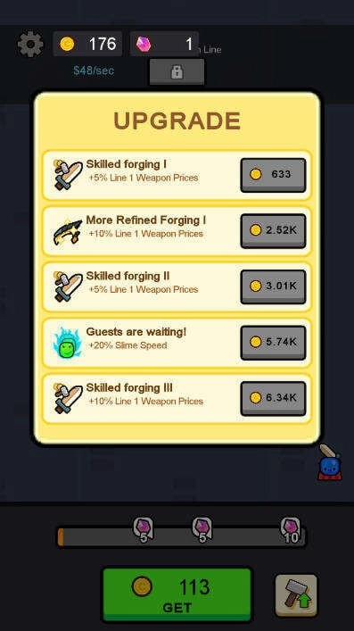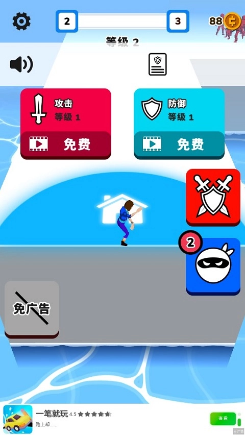 通关新手教程,返回主页可以通过强化攻击或防御来提升战力。除了升级攻击力和防御值,游戏内还提供了数十种武器,每种武器的解锁条件对应角色等级。