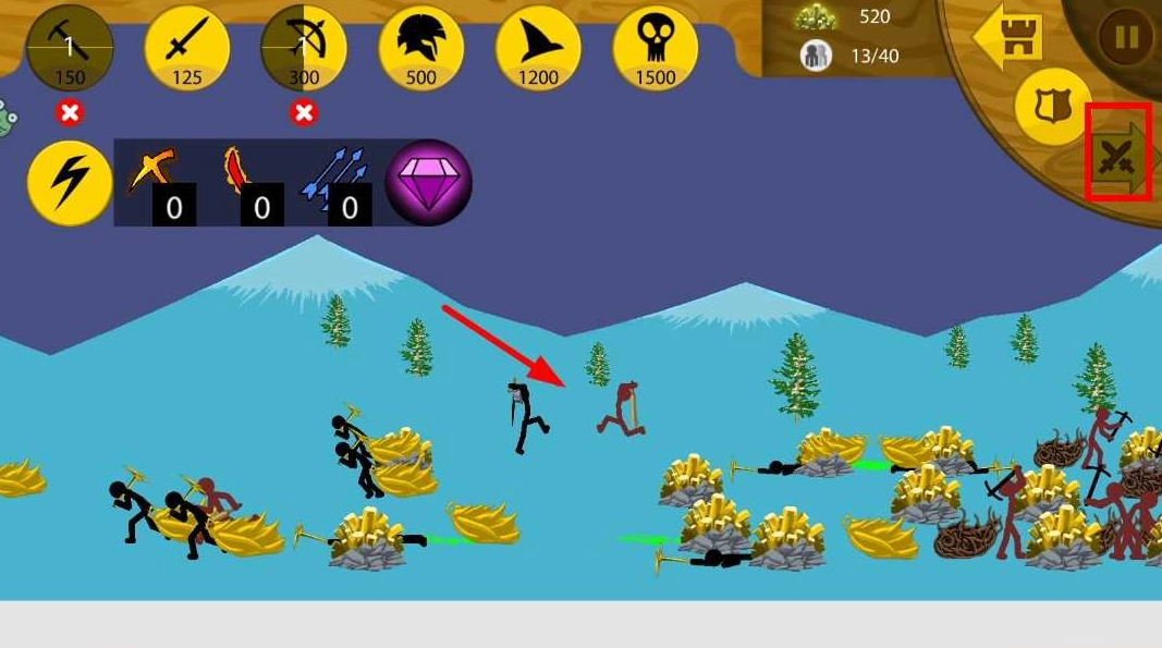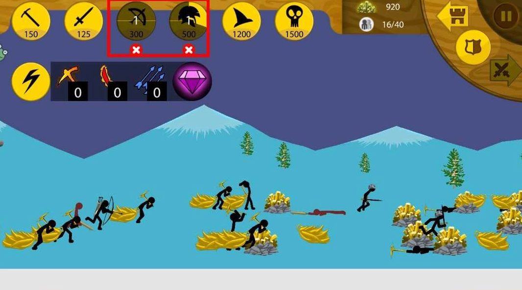 4、根据战斗需求,点击上方不同兵种图标,可召唤相应的火柴人士兵,如弓箭手、持盾战士等,壮大己方战斗力量,助力取得胜利。