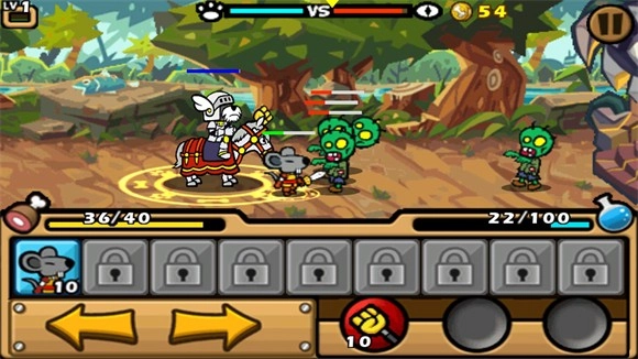 5、正式开始后下方是可以召唤的兵种,箭头是可以控制角色移动的,右下方的按钮是角色的技能,使用需要消耗魔力,魔力是用蓝色瓶子显示的。