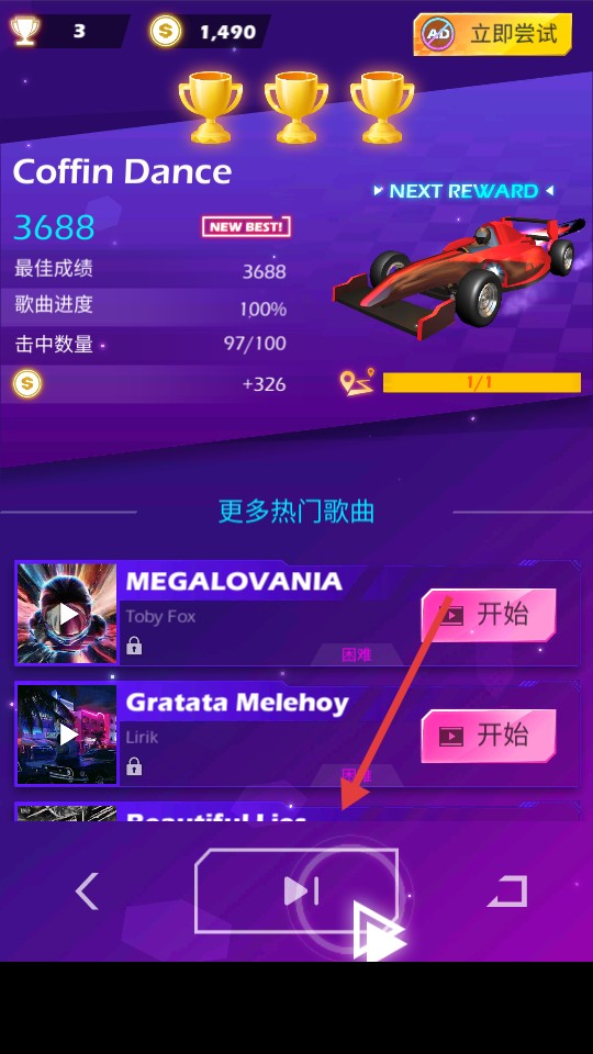3. 进度解锁机制:玩家完成赛事任务后,可解锁全新赛车与音乐曲目,持续获取新的游戏内容与挑战目标。