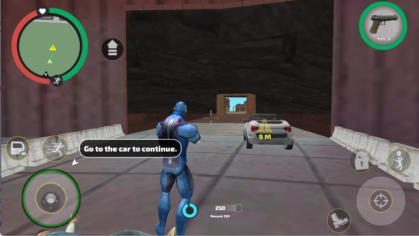 1、游戏界面被划分成左右两个操作区域:左侧区域按从上到下的顺序排列着地图查看、奔跑切换和角色移动这几个按钮;右侧区域从上至下依次展示着角色能量条、血量值,还有上车(需满足特定条件才会出现)、跳跃、绳索发射、攻击以及脚踢这些操作按钮。另外,用手指在屏幕上滑动可以自由调整视角,让操作更加流畅。