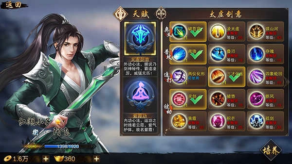 2. 武学修炼:通过习得各种武学功法,自由搭配招式,形成个性化战斗流派,提升战斗实力。