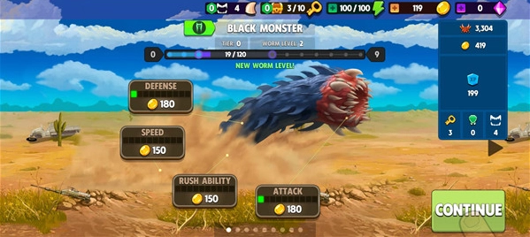 3、尽量多收集金币,持续提升蠕虫的各项属性,使其能挑战更多高难度关卡。