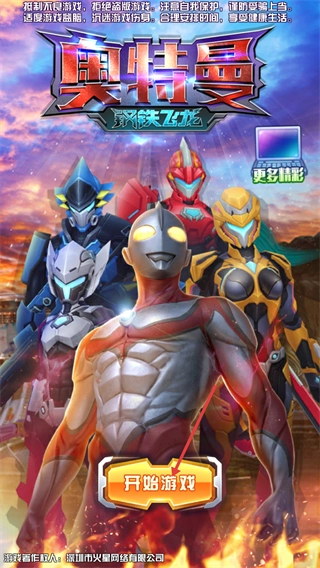 进入《奥特曼-钢铁飞龙》的启动界面后,点击界面中间的【开始游戏】按钮就能进入关卡,另外还可以关注右上角的【更多精彩】按钮,通过它查看额外的内容。
