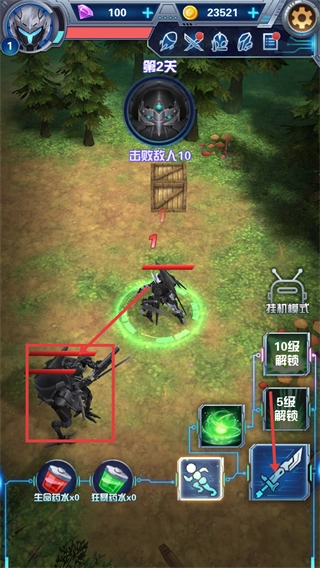当前处于【第2天】关卡,目标是【击败10个敌人】,右侧设有【挂机模式(10级解锁)】,底部配备道具栏,同时还能关注【装备栏(5级解锁)】。