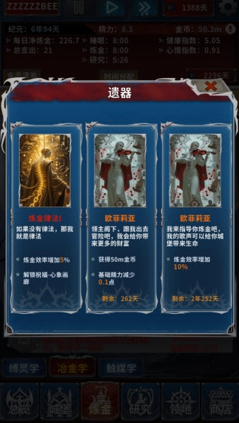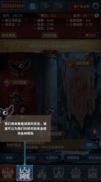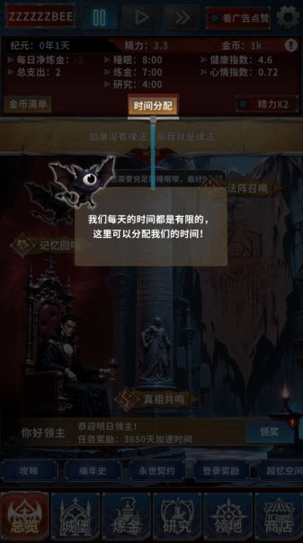 睡眠至关重要,建议保证8到9小时的时长。炼金系统可用于生成金币,还能制作各类炼金物品以助力升级。
