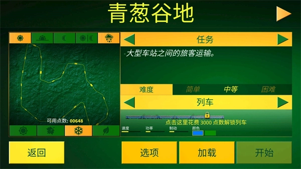 点击自由模式后,玩家能够挑选不同的地形、天气、任务与火车,选定之后就可以点击开始,开启自己的运送任务。