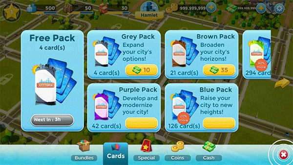 在商城里,玩家也能购买城市卡,以此建造更多实用建筑,进而实现城市的扩建。