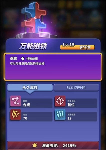狱火怒龙具备出色的群体攻击能力,当自身点数低于对方总点数时还能触发双倍伤害;若与堡垒的群攻特性、反应堆的攻速及攻击加成搭配使用,便能实现高效清怪。而万能磁铁拥有和魔镜相同的合成技能效果,搭配分裂装置则可以快速让防御塔布满整个地图。