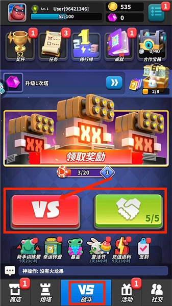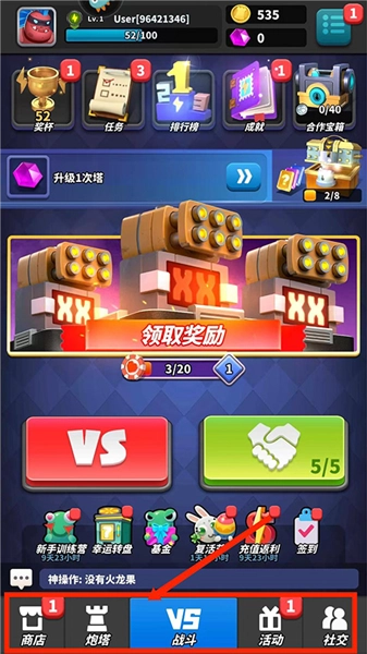 启动僵尸风暴游戏后,待进入游戏主界面,会看到其包含【商店】、【炮塔】、【战斗】、【活动】与【社交】这几个栏目。