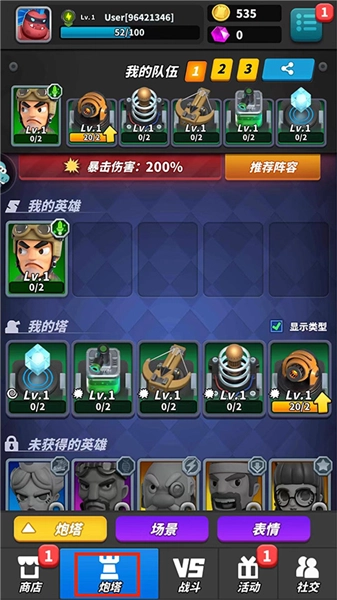 进入【炮塔界面】后,玩家能在此处进行阵容搭配、查看英雄信息、升级炮塔,还可以管理场景与表情。