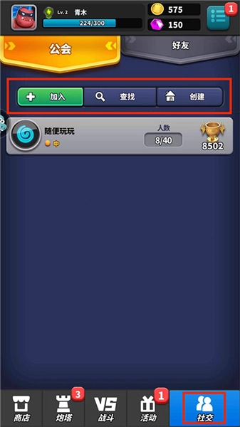 玩家进入【社交界面】后,可在此处进行工会的加入、查找与创建操作,同时也能添加好友。
