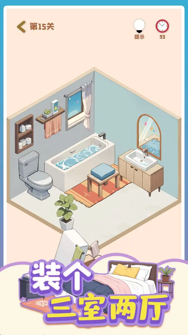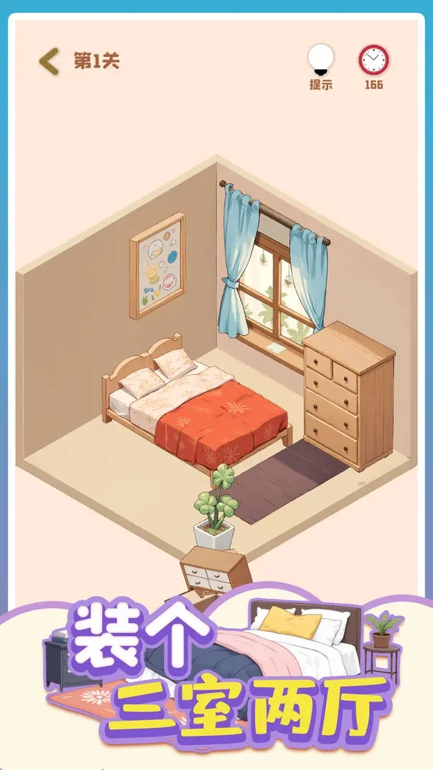 《装个三室两厅》是一款趣味十足的休闲游戏,核心玩法就是合理摆放各类家具与饰品。游戏设有丰富的关卡供玩家挑战,随着关卡深入,难度会逐步提升,提供的物品数量也会越来越多。玩家需要巧妙规划这些物品的摆放位置才能顺利通关,若是随意放置,很可能到最后会发现房间里没有足够空间容纳所有物品。
