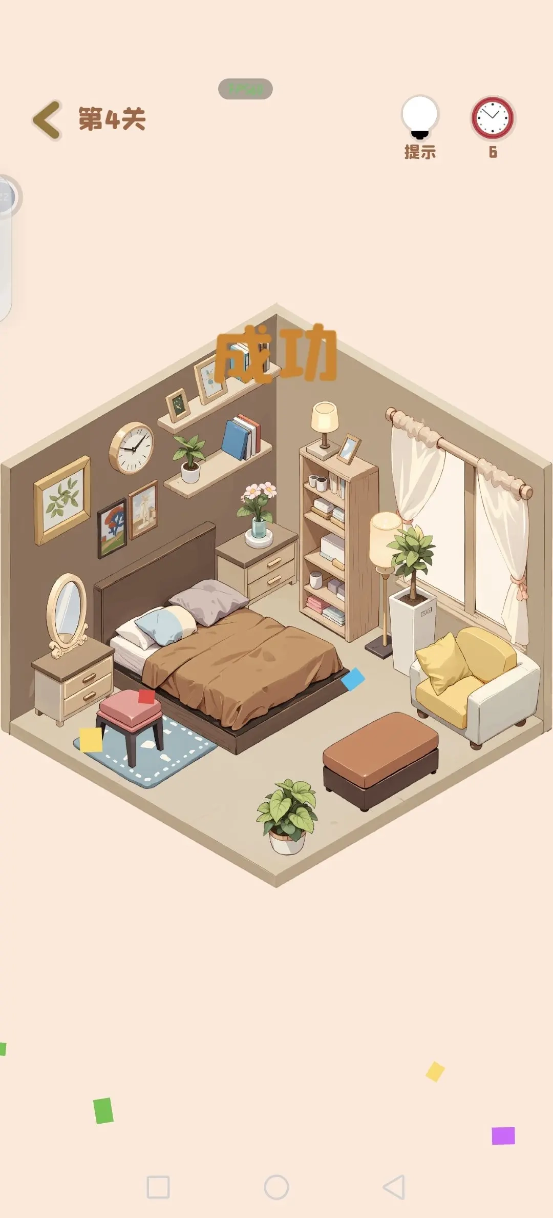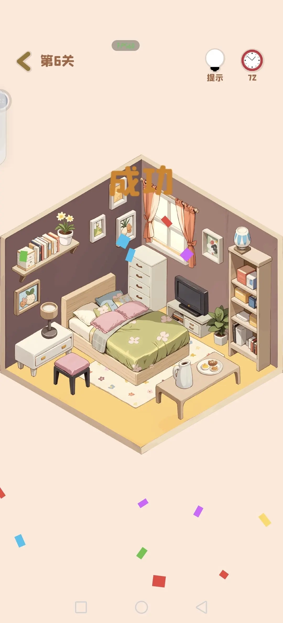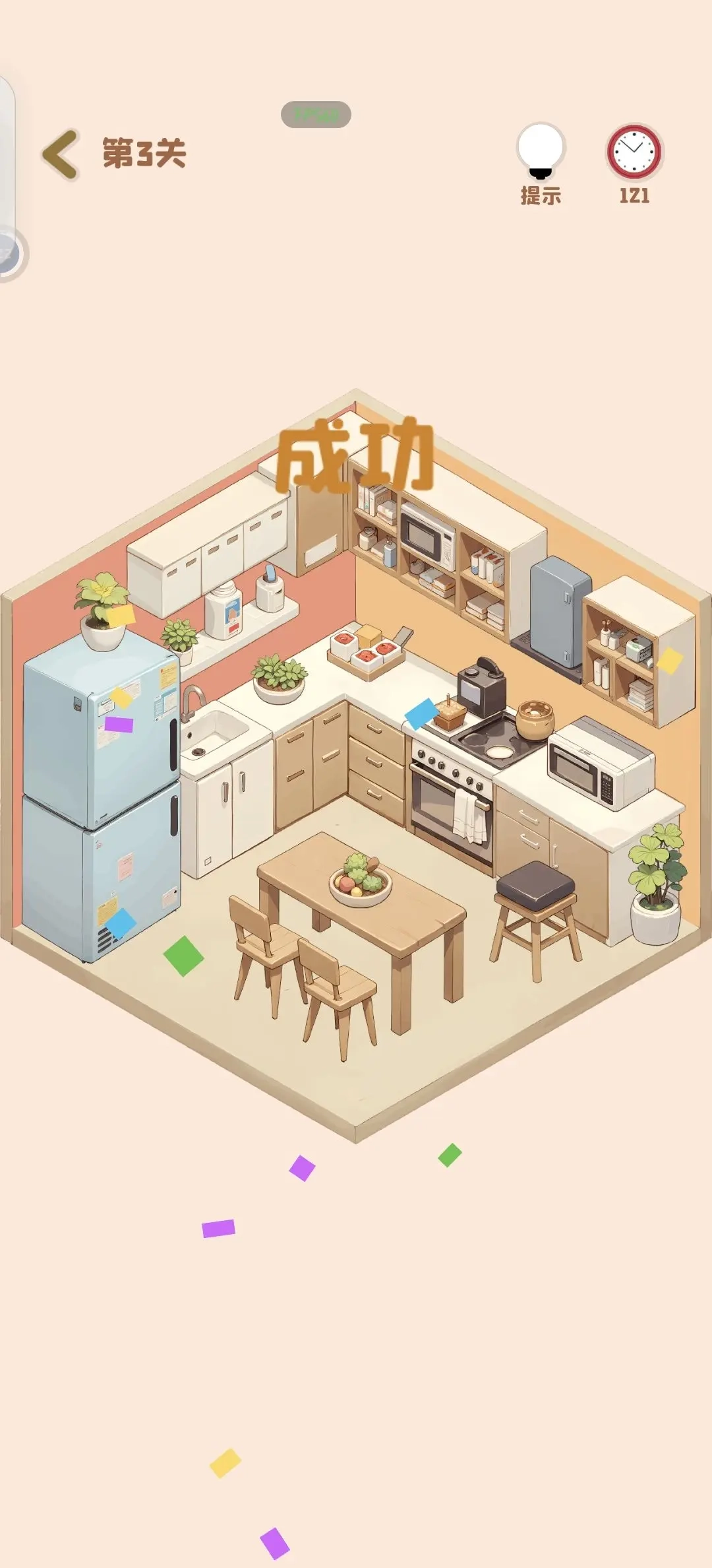 玩家需要点击纸箱来获取家具,并在规定时间内完成摆放。要是碰到困难,还能点击提示按钮寻求帮助。