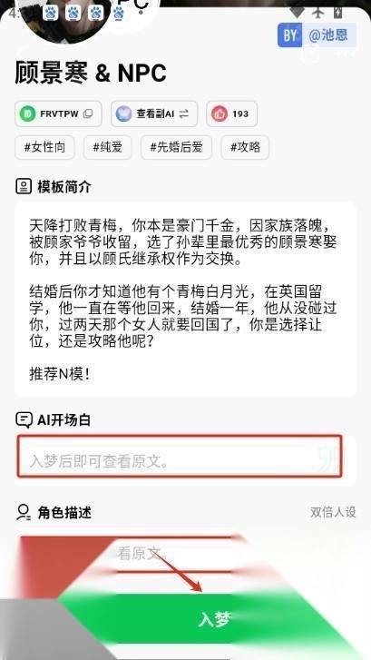 你能够设置AI的开场白与角色描述,完成后点击“入梦”按钮就可以了。