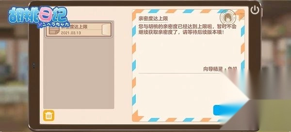 不会吧不会吧,还有胡桃的粉丝不知道什么是亲密度的吗?!简单来说,就像大家理解的那样,你和胡桃通过互动、一起玩游戏等方式提升的你们之间的亲密指数,这就叫做【亲密度】啦!目前版本里亲密度的最高等级是7级,所以等亲密度到7级之后,暂时就不能再增加亲密度了哦(要留意本兔发的邮件提示呀!)~让我们一起期待正式版本吧!