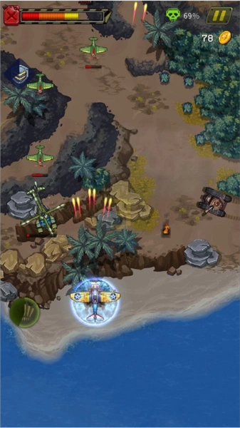 战斗过程中会陆续解锁各类辅助功能,助力我们提升作战表现。此刻界面上出现了空军1945游戏的盾牌标识,获取该道具后将生成防护屏障,可有效抵御敌方战机的弹道攻击。