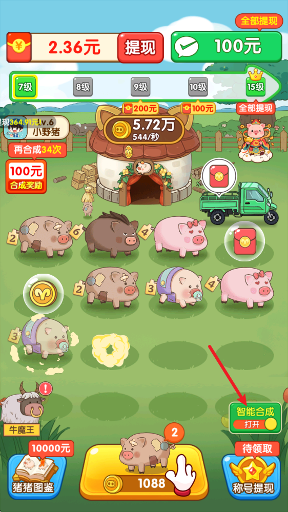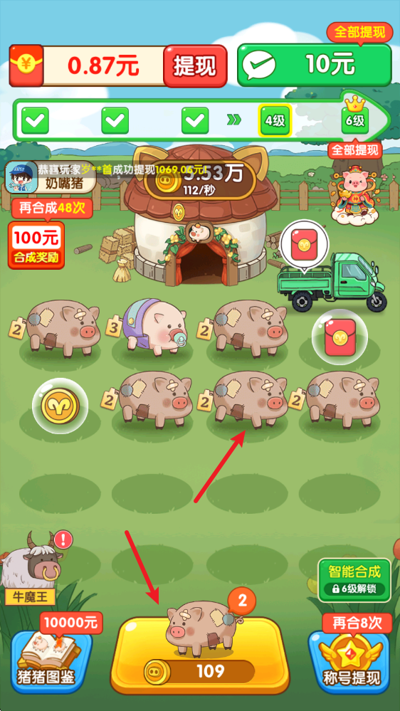 2、游戏里每次合成都会获得更高级别的小猪,而且解锁新猪猪时,我们还能拿到对应等级的奖励哦。