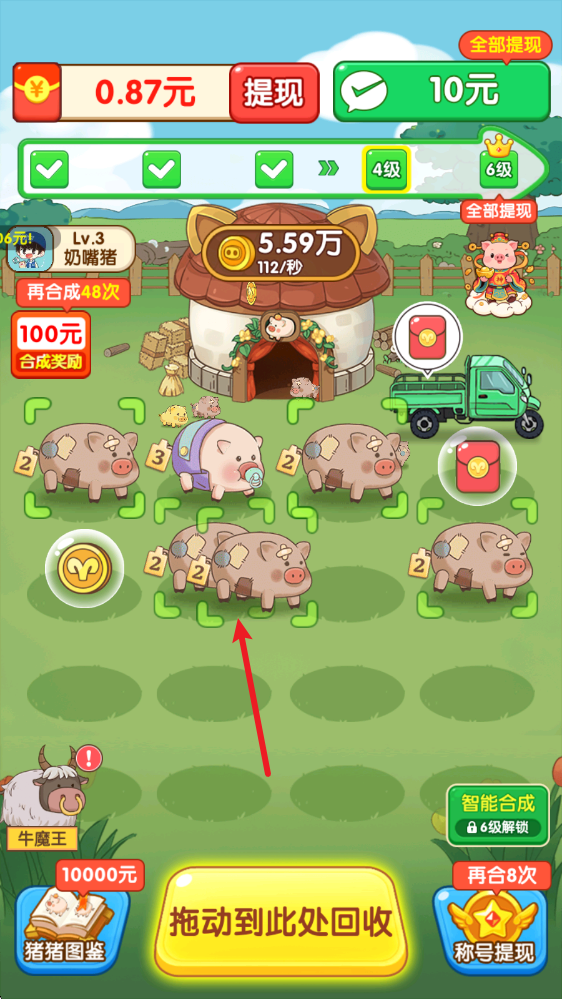 2、把相同的小猪拖动到一起重叠,就能合成出更高等级的小猪。