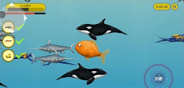 游戏里玩家能够挑选三种游戏模式,分别是饥饿的金鱼、海豚大逃亡和纳米鲨鱼。
