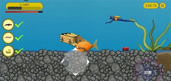 游戏里的操控运用虚拟摇杆的方式,左侧用来控制小鱼移动,右侧则是耐力加速功能,点击就能触发加速效果。