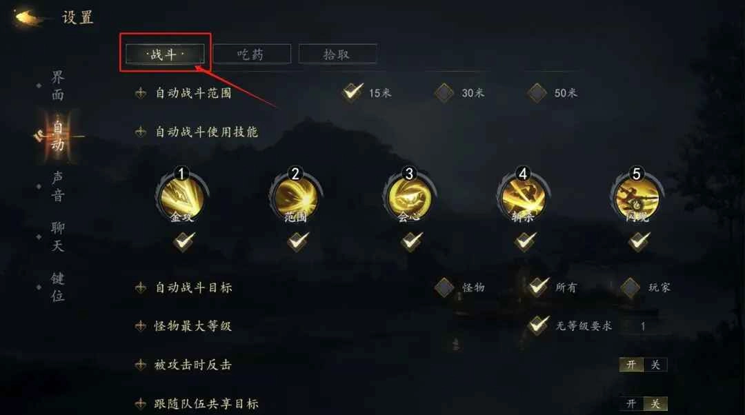 要留意自动战斗目标的设定,挂机打怪时得注意勾选对应的类型