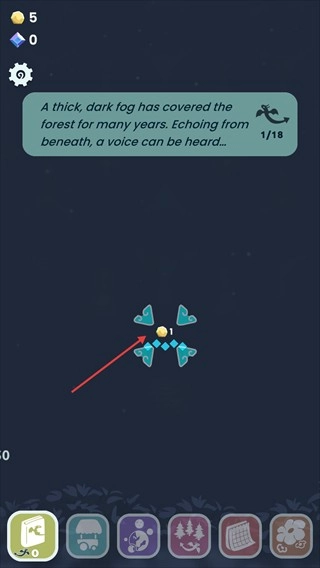游戏界面出现剧情提示【A-thick-dark-fog-has-covered-the-forest-for-.】,当前进度为【1/18】,需要收集相应资源来推动剧情进展。
