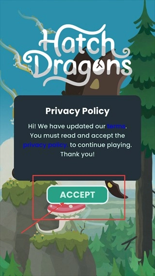 进入【Hatch-Dragons】后,会弹出【Privacy-Policy】的更新提示,需要阅读并点击【ACCEPT】按钮,完成这一步操作后才能继续进入游戏界面。