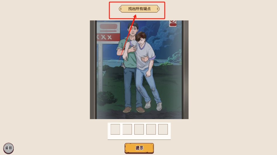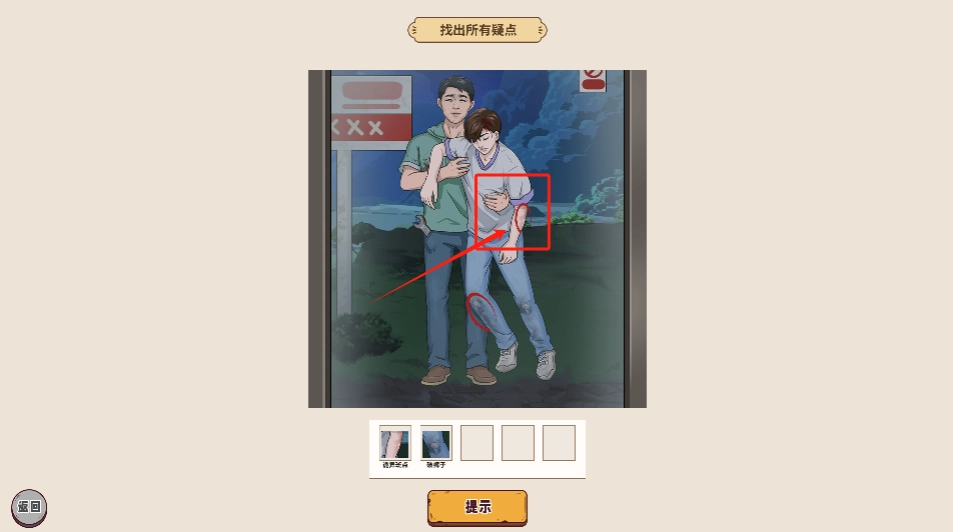仔细观察画面中两位男子的互动细节,找出可疑之处并点击,以此填满下方的五个空白格。
