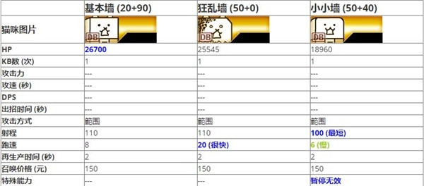 2、小小墙的移速偏慢,只有6,比基本墙还要慢。如果没有抽到波动灭止的猫咪,可以在一些有无尾熊或大嘴鸟的关卡,或是挑战狂乱腿、狂乱巨人的时候,搭配基本墙+中后排输出减少敌人击发波动的机率。
