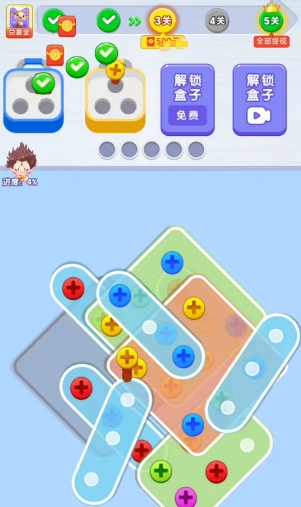 2、每个螺丝盒都能够放入三个相同颜色的螺丝,放满后即可消除,随后出现新的盒子。