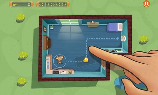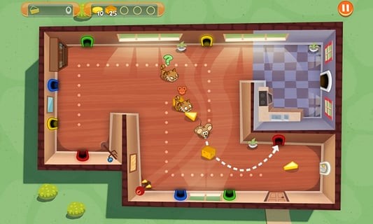 第四关里,间谍鼠的逃生门刚好在猫咪的移动路线之后,被堵得严严实实。奶酪也在小黄猫的正前方,所以按照游戏提示,玩家第一步得把猫咪引开。之前小编也提过,这个场景里的黄色小猫,移动速度和反应能力都比较慢,所以玩家只要出其不意地改变间谍鼠的移动路线,先吸引小猫的注意,让它离开原本的移动路线来追捕间谍鼠,接着控制小老鼠在猫咪后面跑,再跟着箭头提示快速到达奶酪的位置,最后从门口逃生就行啦。
