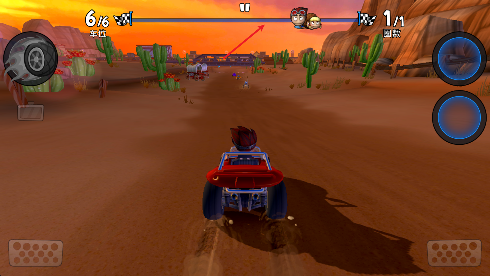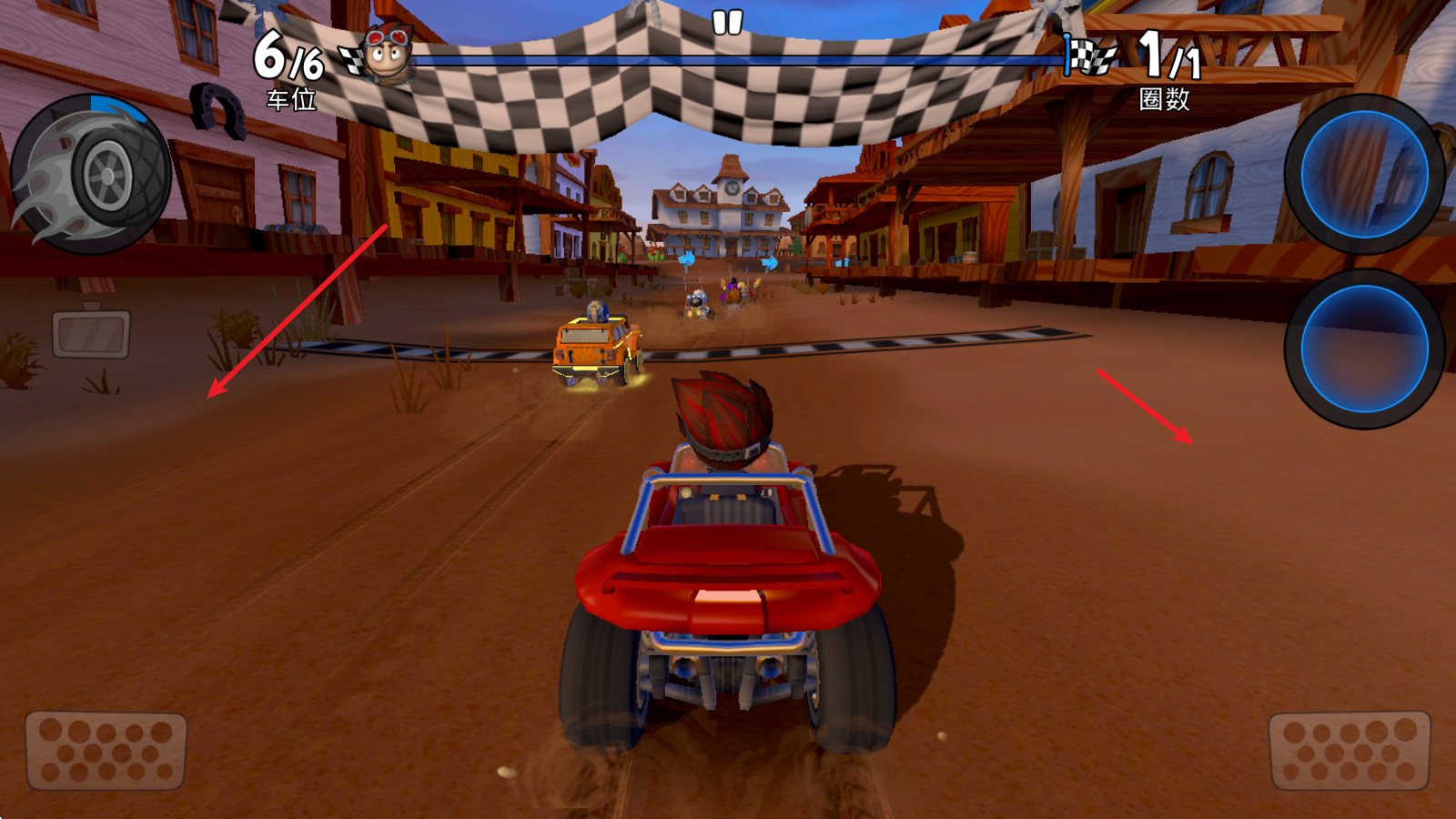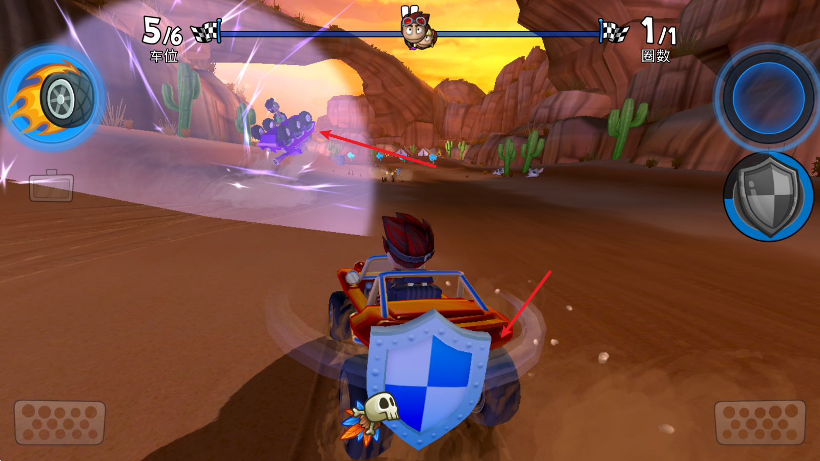 1、在比赛中灵活操控你的沙滩车,充分利用每一个获得的道具和自身技能,助力自己赢得比赛胜利。