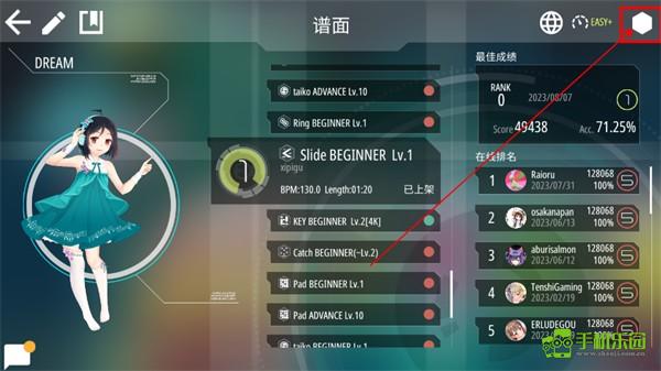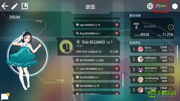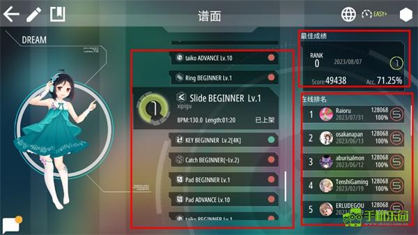 7、这是打歌界面,中间区域用于选择谱面,右侧则展示着排行榜和玩家的最佳成绩