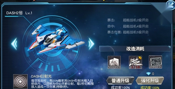改造DASH1号时,有几率将战机改造成超能战机DASH2号,当DASH2号达到Lv3时,DASH2衍射光:每次攻击时,都有20%的几率将衍射光打入敌方体内,并对周围单位造成每两面一次的伤害,持续6秒。