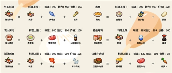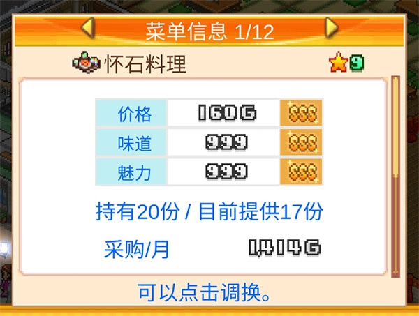 3、菜品价格同样由八维图的数值直接决定,每种食物都有其对应的价格、味道和魅力上限,所以在菜品研发时,优先选择上限较高的菜品,通常能收获事半功倍的成效!