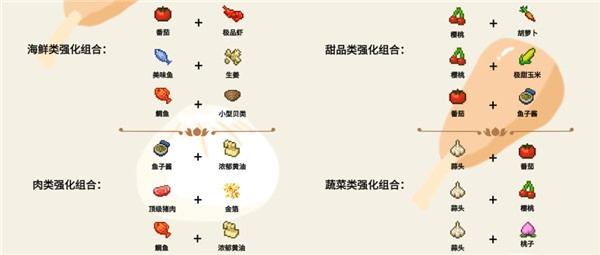 5、每种菜品根据其自身的风味以及品类,都有与之最适应的强化食材,这部分只能通过平时的日常积累自行摸索,这里只能罗列一些比较通用的以供参考