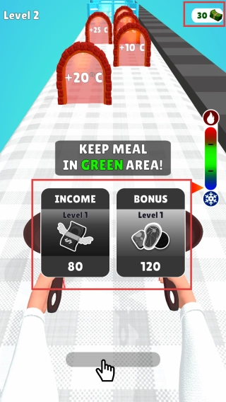 在跑酷过程中,我们需要将食物的火候控制在右侧温度条的绿色区域,通过点击屏幕让角色左右交换食物,借助穿过火炉或冰柜来调整温度。