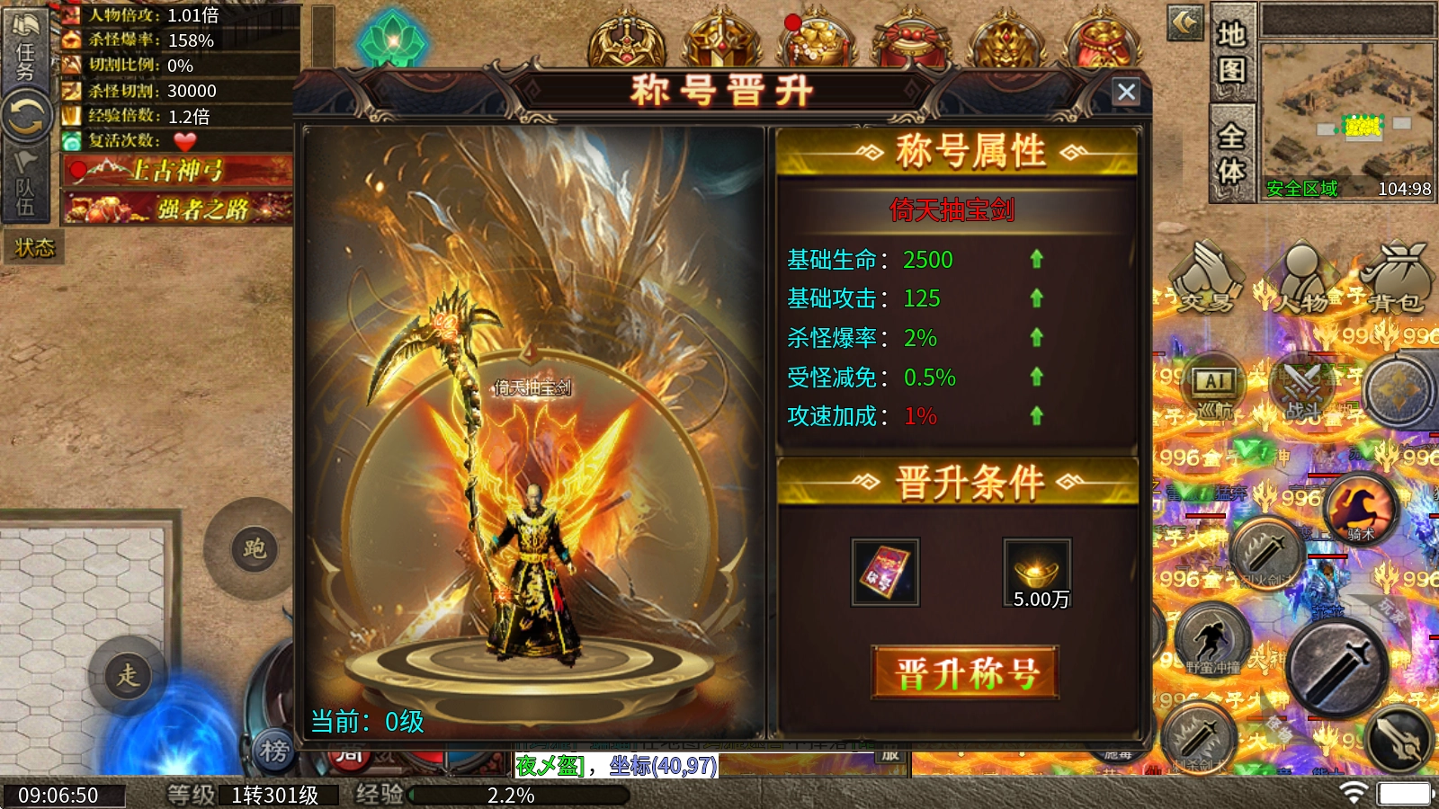 2、称号晋升:消耗称号卷轴和元宝来晋升称号,每一级都可以提升生命和攻击还能增加爆率和攻速。