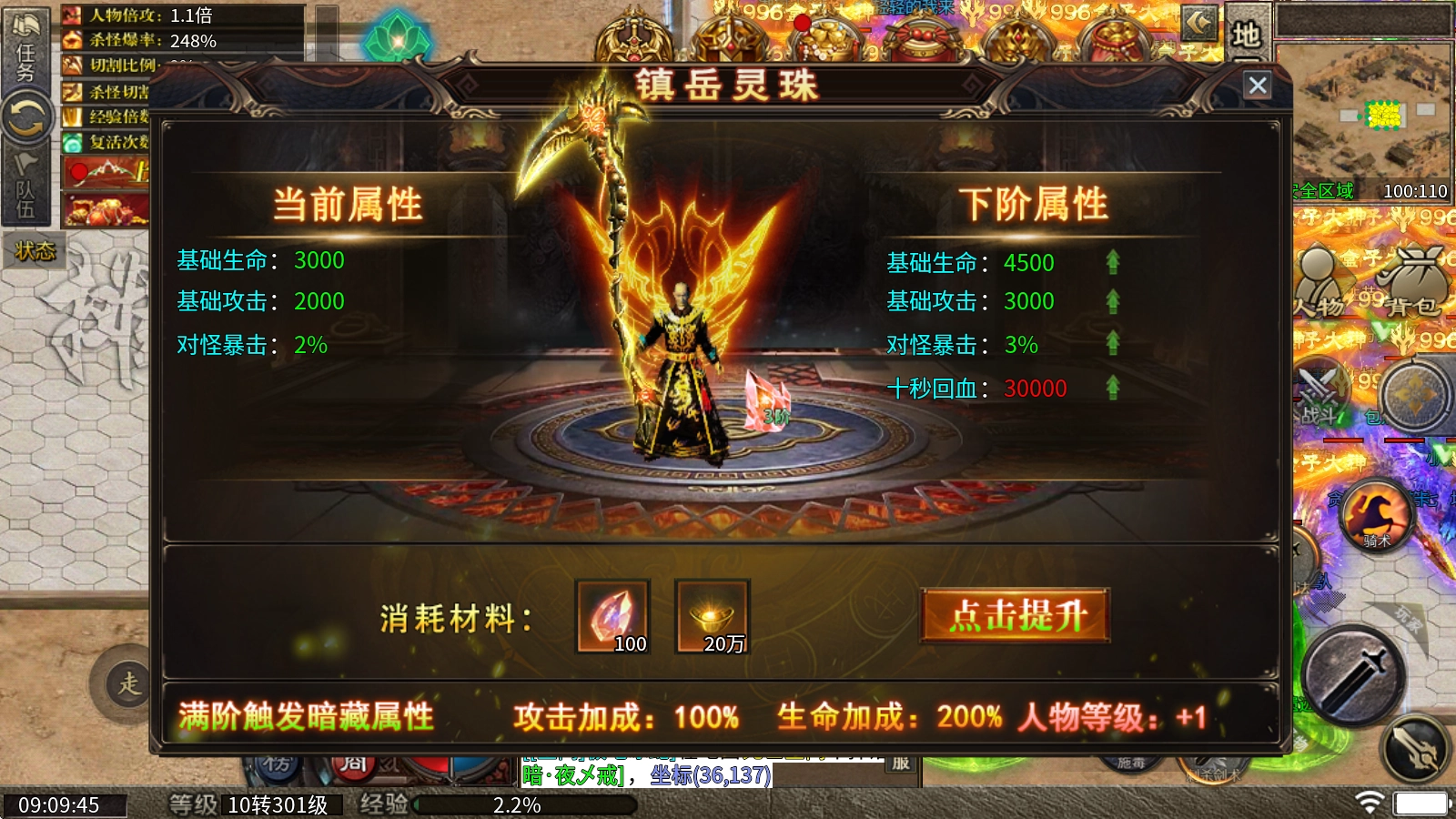 5、镇岳灵珠:消耗七彩灵石和元宝进行提升,能够提升对怪爆率和十秒回血。