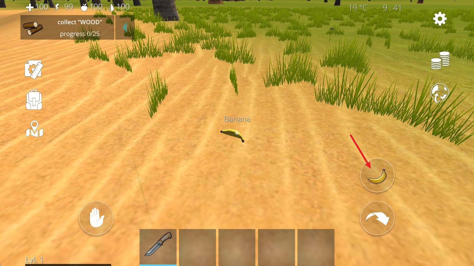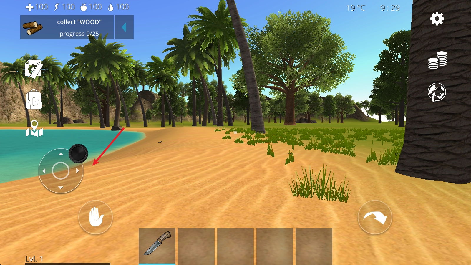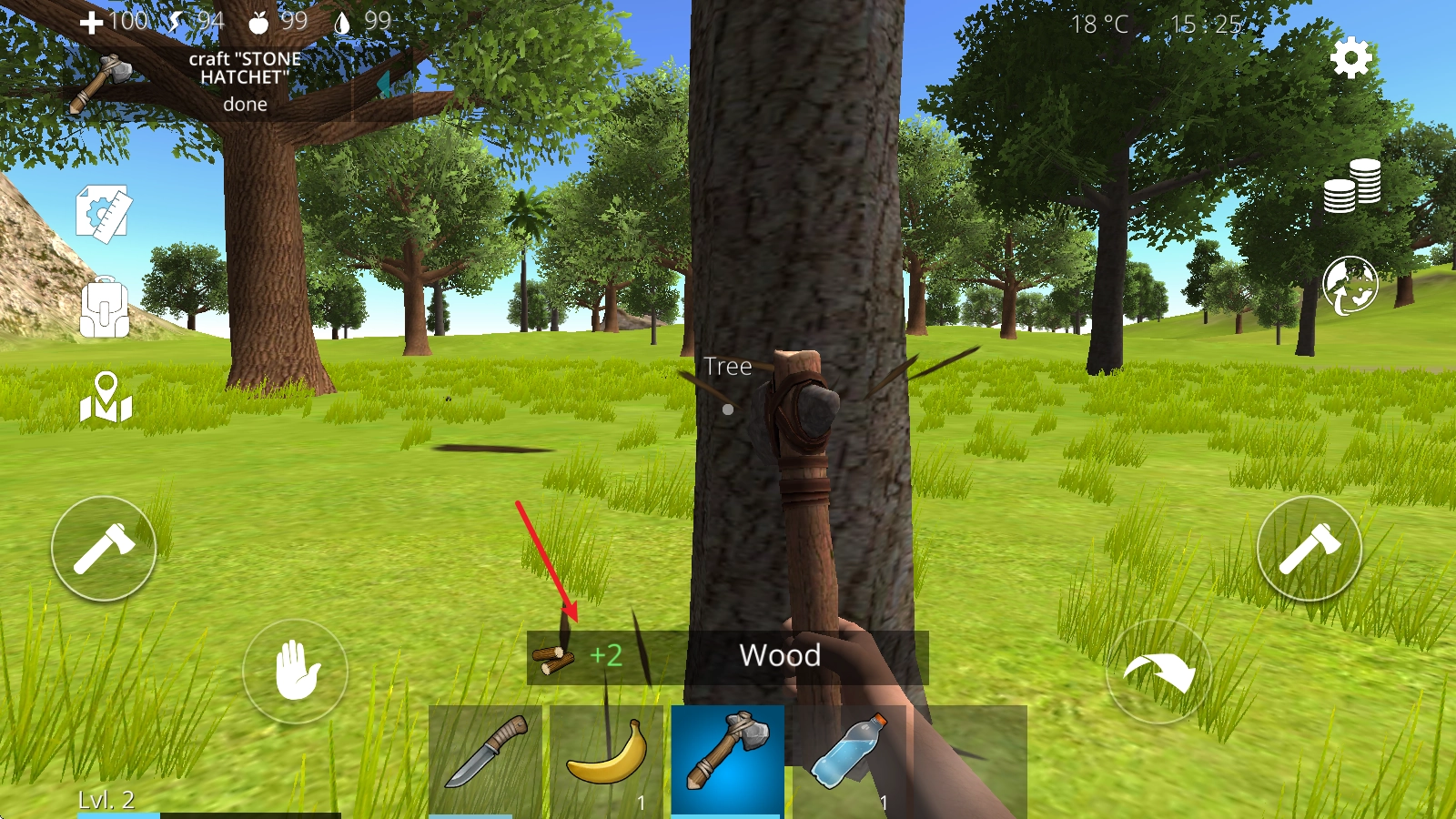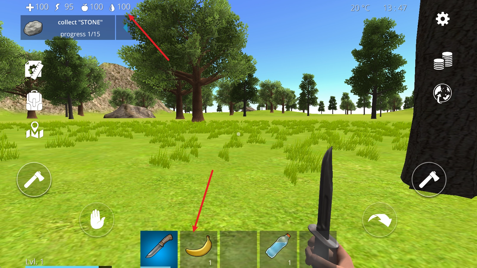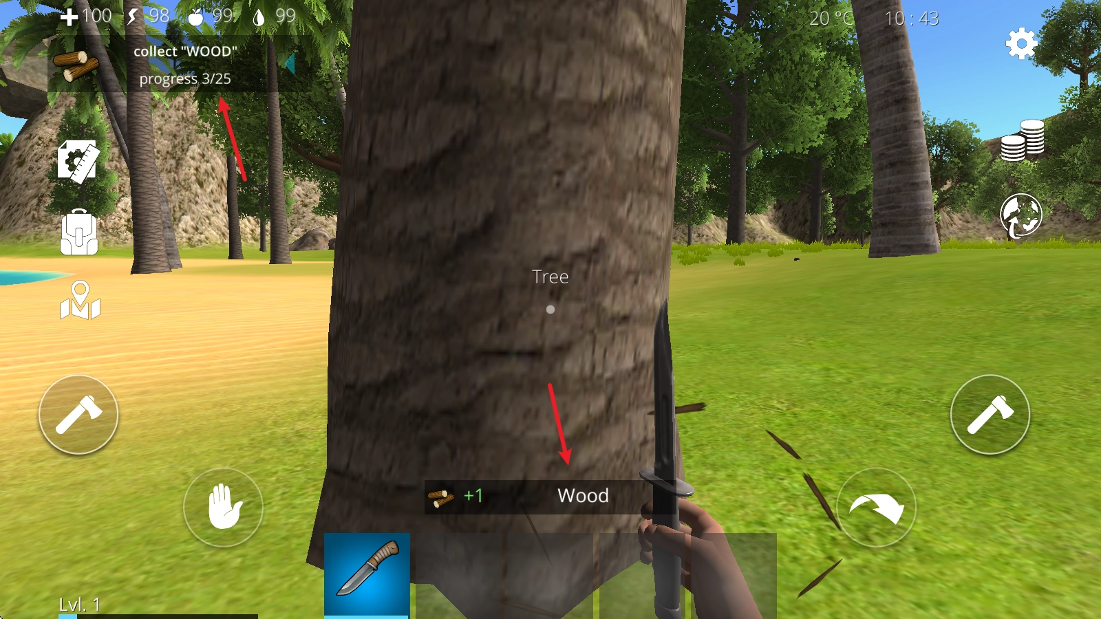 4、比如在这里取出小刀后,我们对准树木就能获取树木资源,同时还能完成左上角显示的任务。